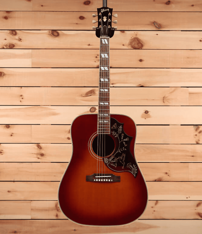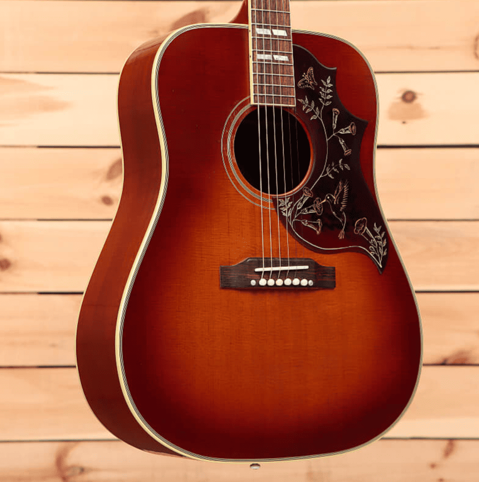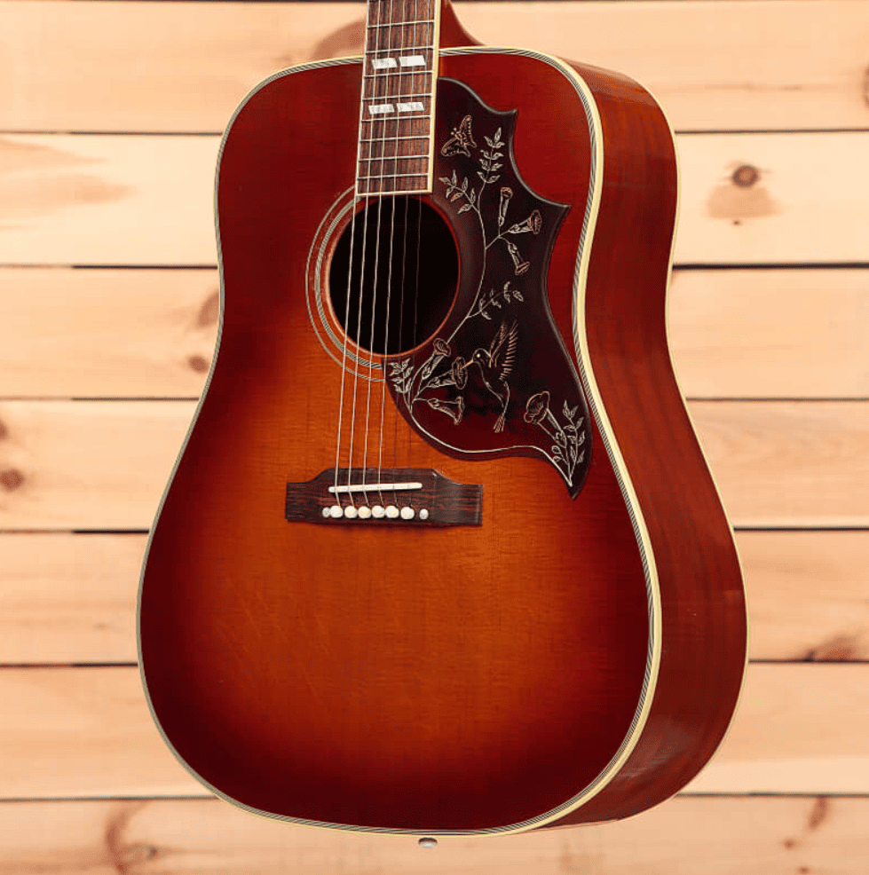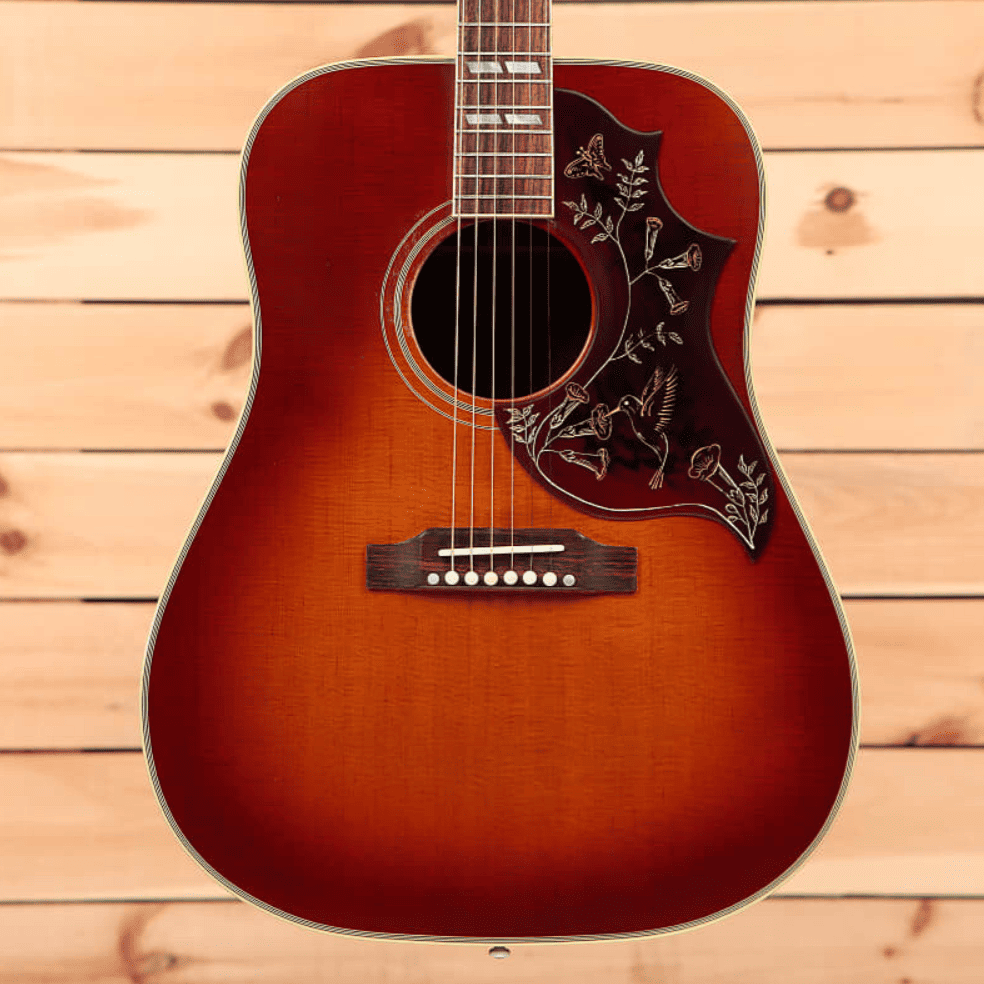 Ни с чем не сравнимая Gibson Hummingbird известна как одна из самых замечательных акустических гитар компании. В новом дизайне Hummingbird сочетаются винтажные элементы декора и современное высококачественное исполнение. Модель в черной отделке оснащена золотыми гроверными колками Gotoh Keystone, двойным состаренным переплётом, традиционной крышкой для фирменных стержней Hummingbird, костяным порожком и седлом. Инструмент поставляется в комплекте с кейсом.