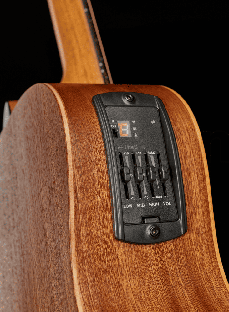 Активный предусилитель ES-B дополнен трёхполосным эквалайзером, встроенным цифровым тюнером и чётким светодиодным дисплеем. Это позволяет добиться гибкого управления звуком. Гитара дополнена литыми колками Taylor и поставляется в комплекте с чехлом.