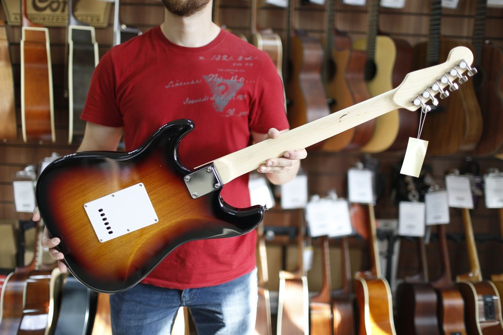 Качественный звук, классный дизайн и цвет - это атрибут гитары музыканта, любящего вызывать восхищение. Изготовлена из древесины твердых пород и сделана гитара под известные американские стратокастеры - Fender.